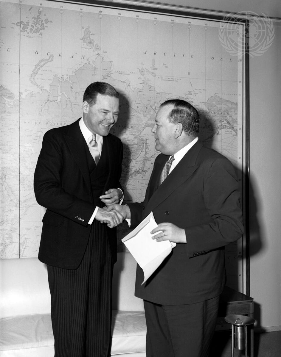 Henry Cabot Lodge Jr. (left), newly appointed Permanent Representative of the United States to the United Nations, shaking hands with U.N. Secretary-General Trygve Lie, after presenting his credentials. Cabot Lodge, a former Senator and member of the U.S. Senate Foreign Relations Committee, succeeds Warren Austin as Head of the United States Mission to the United Nations.