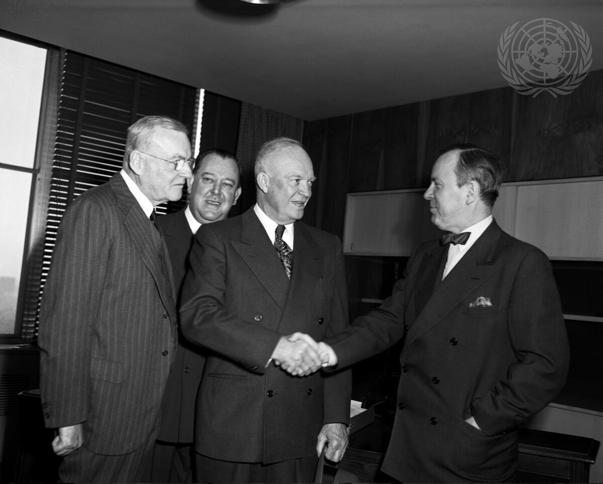 Pictured in the Secretary-General's office from left to right: Mr. Trygve Lie, Secretary-General of the United Nations, President Elect Eisenhower shaking hands with Lester B. Pearson (Canada), President of the current session of the United Nations General Assembly.