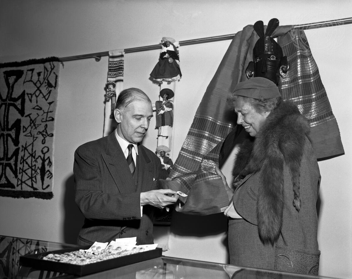This picture shows Eleanor Roosevelt and Cesar Gonzales, Permanent Representative of Venezuela, looking at some of the items on display. The gift centre is located in the Public Concourse Lobby of the new General Assembly building.