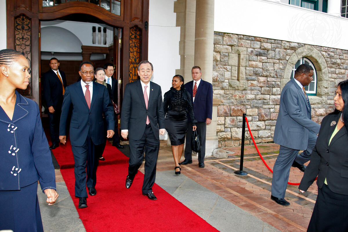 Secretary-General Ban Ki-moon (fifth from right) departs from the Presidential guest house, accompanied by Kgalema Motlanthe, President of the Republic of South Africa, after their meeting.