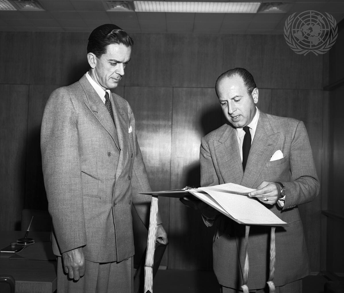 Claes Carbonnier (left), a member of the Swedish delegation to the United Nations, represented his country at the brief ceremony in the office of Constantin Stavropoulos (right), Principal Director of the U.N. Legal Department, who accepted the instrument on behalf of the U.N. Secretary-General.