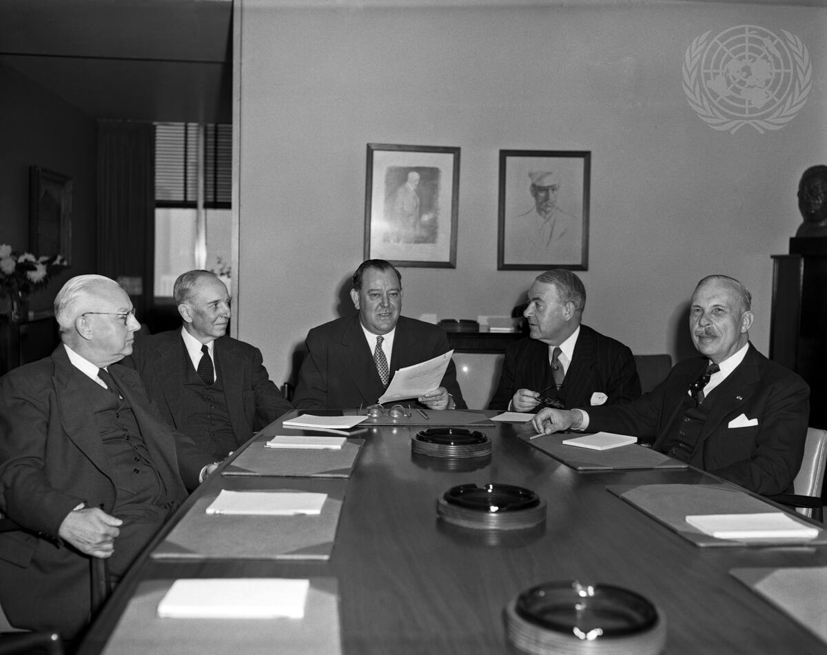 Seen here from left to right, around the conference table: Mr. Byron Price, Assistant Secretary-General of the U.N. in charge of Administrative and Financial Services; Mr. William Dewitt Mitchell, of the United State of America; U.N. Secretary-General Trygve Lie; Sir Edwin Herbert, of the United Kingdom; and Professor Veldekens, of Belgium.