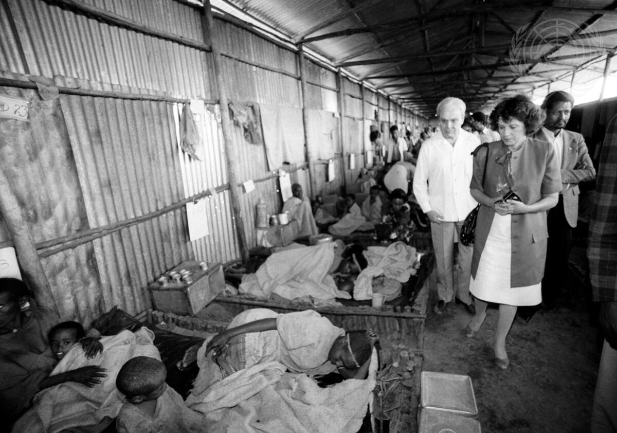 Secretary-General Javier Perez de Cuellar made an official visit to Ethiopia, 8-13 November 1984. After flying to drought-stricken areas of the country, he addressed the Summit Meeting of the Organization of African Unity in Addis Ababa and pledged the fullest United Nations support for all the drought stricken countries of the continent.