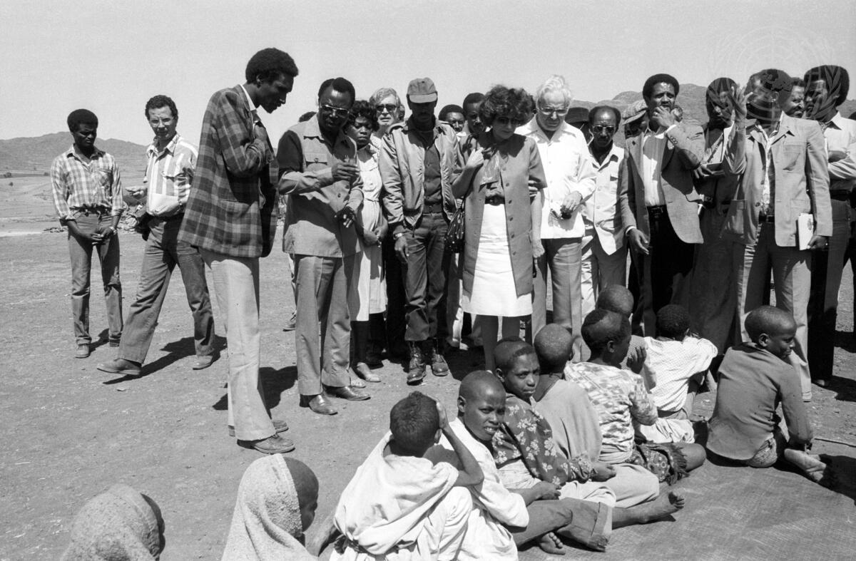 Secretary-General Javier Perez de Cuellar and Mrs Perez de Cuellar visiting young drought victims at Korem which is at the centre of one of the worst-affected areas.