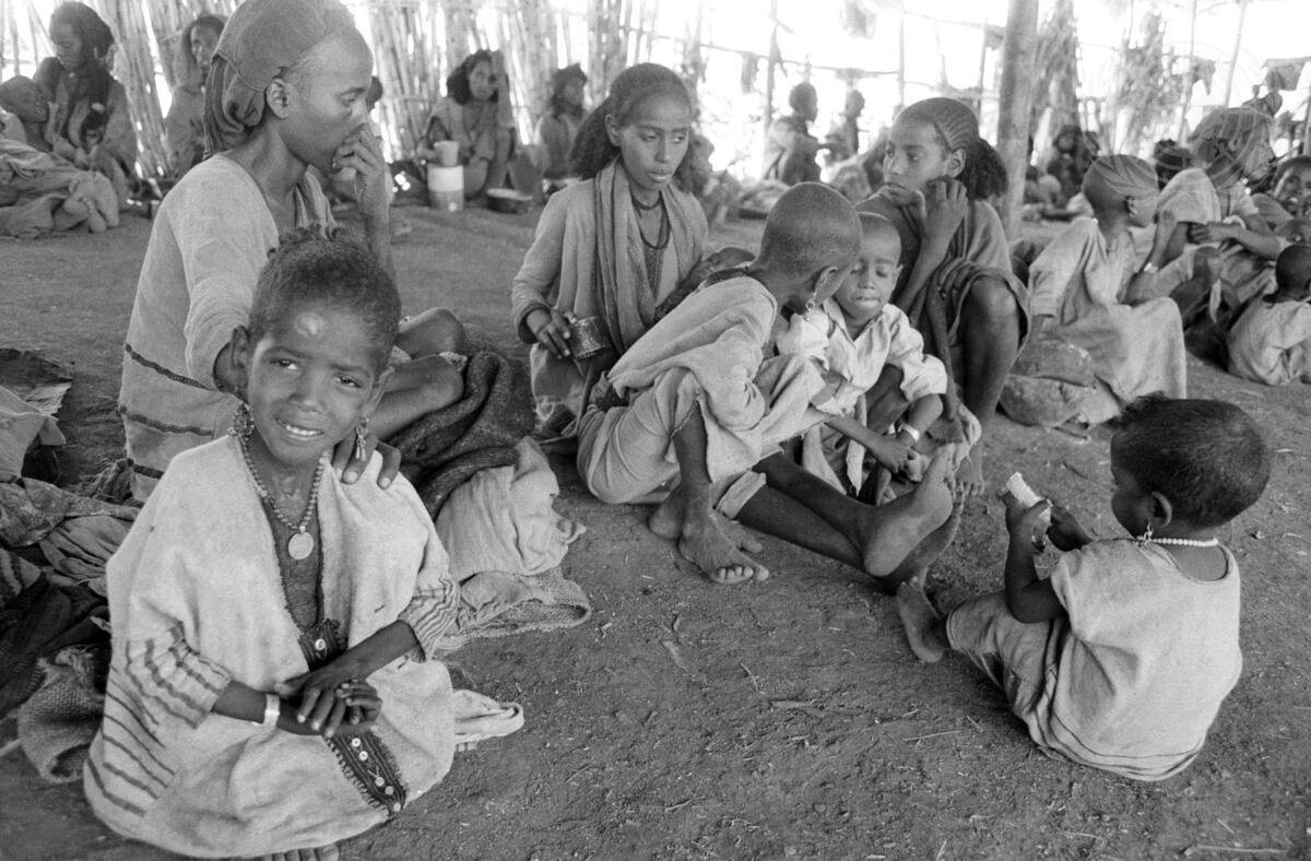 Starving children and their mothers waiting for food at a camp at Harbu, twenty kilometers from Kombolcha in north-eastern Ethiopia. The camp for famine victims is run by Concern, an Irish Catholic aid organization.