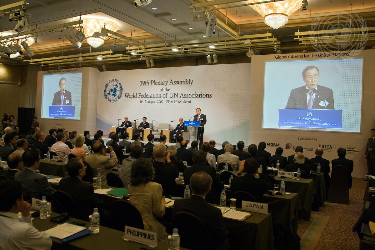 Secretary-General Ban Ki-moon (standing) addresses the opening ceremony of the 39th World Federation United Nations Associations (WFUNA) Plenary Assembly in Seoul, Republic of Korea. Mr. Ban spoke about sustainable development, peace and disarmament, human rights and UN reform.