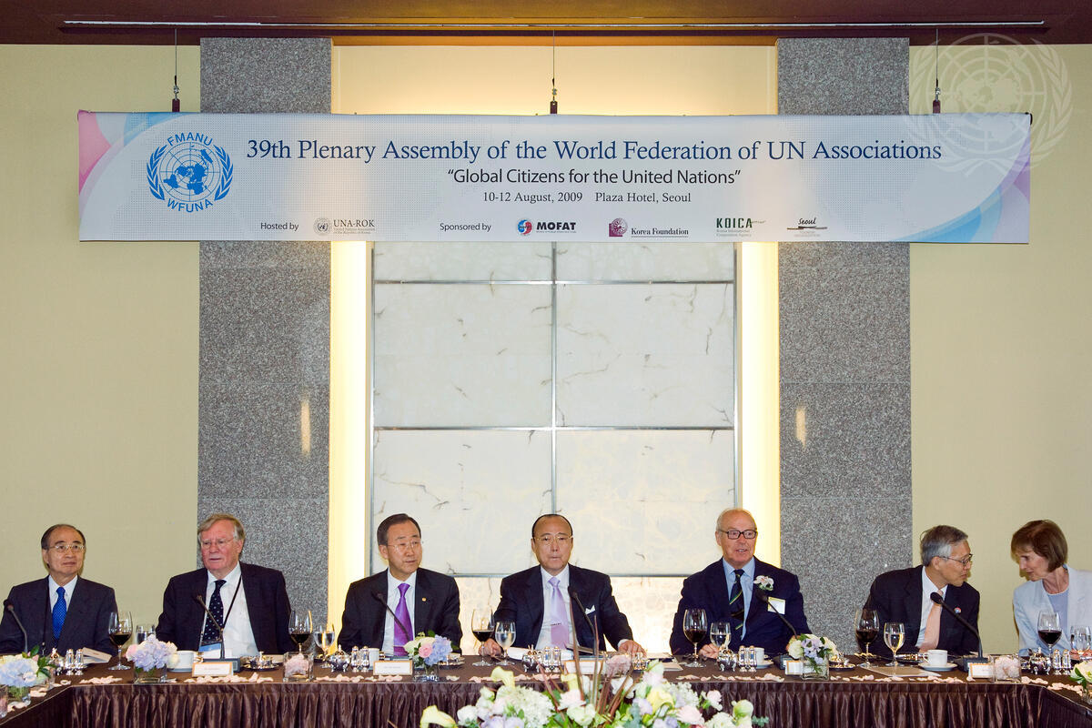 Secretary-General Ban Ki-moon (third from left) attends a luncheon during the 39th World Federation United Nations Associations (WFUNA) Plenary Assembly hosted by Kim Seung Youn (centre), President of the United Nations Association of the Republic of Korea, in Seoul. To Mr. Kim's right is Hans Blix, outgoing President of the WFUNA.
