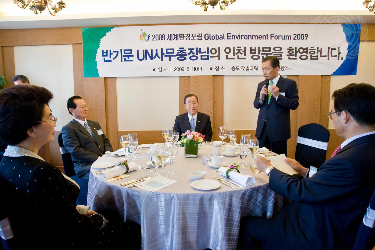 Secretary-General Ban Ki-moon (centre) attends a luncheon meeting hosted by Ahn Sang-Soo (standing, at right), Mayor of Incheon, Republic of Korea.