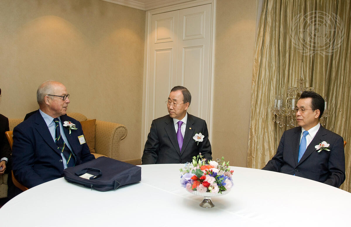 Secretary-General Ban Ki-moon (centre) speaks with Hans Blix (left), the outgoing President of the World Federation of United Nations Associations (WFUNA), and Han Seung-soo (right), Prime Minister of the Republic of Korea, before addressing the 39th Plenary Assembly of the WFUNA in Seoul, Republic of Korea.