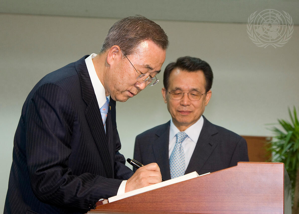 Secretary-General Ban Ki-moon (left) signs the guest book in the office of Han Seung-soo, Prime Minister of the Republic of Korea.