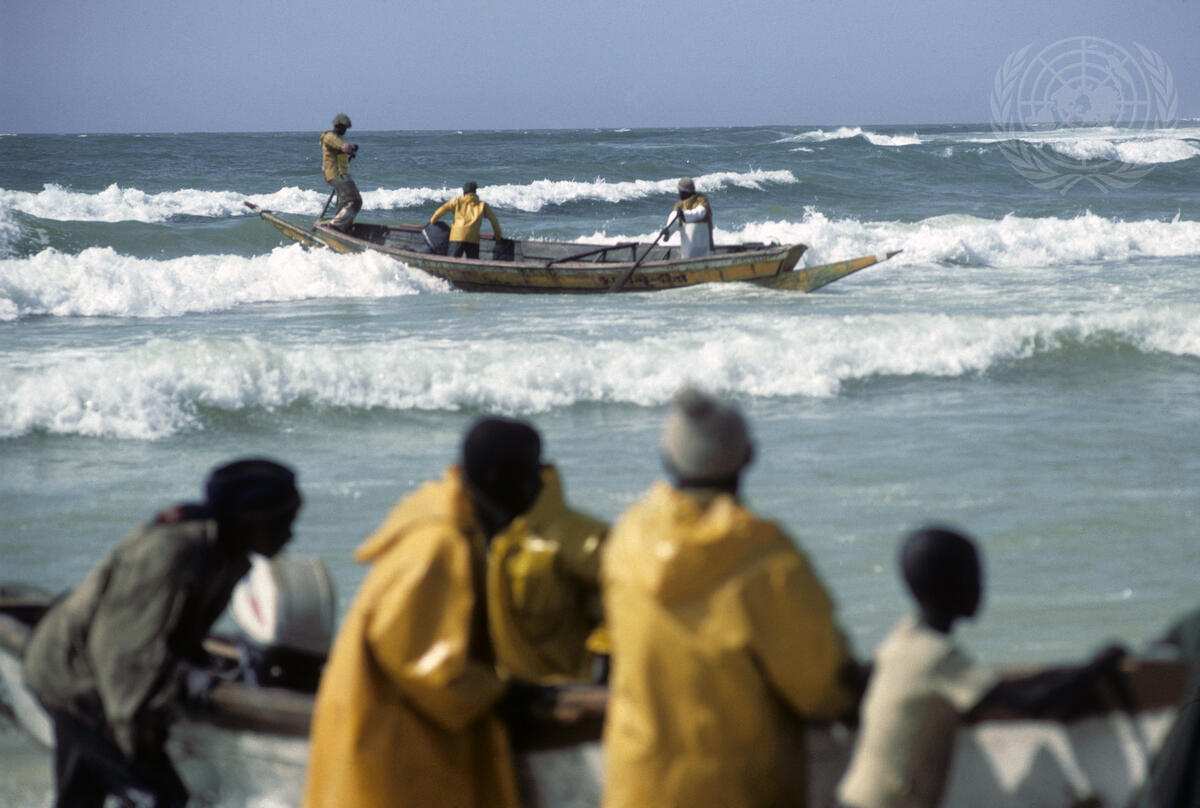 Fishermen in a rowboat returning after an off-shore fishing trip in Kyar, Senegal. [No exact date]