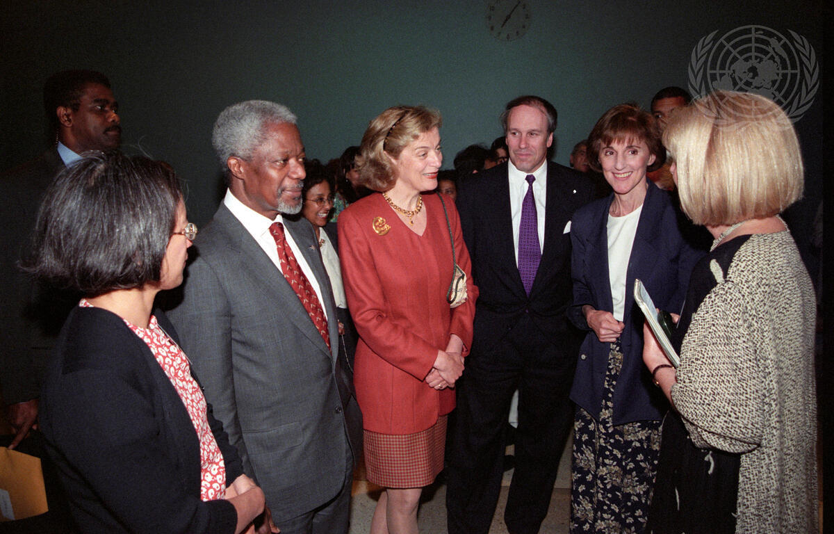 Secretary-General Kofi Annan and Mrs. Nane Annan (second and third from left) attend a reception in the Visitors Lobby by the Academic Council on the United Nations System. The reception launches the 12th Annual Meeting of the Council, coordinated with the opening of an art exhibit on “Regeneration: Rebuilding Torn Societies”.