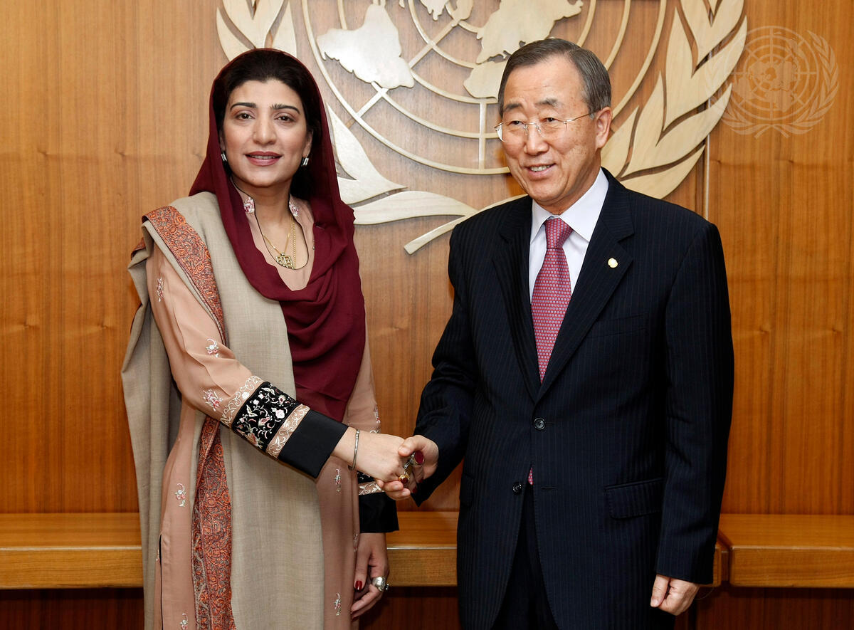 Secretary-General Ban Ki-moon (right) meets with Farzana Raja, Federal Minister, member of the National Assembly of Pakistan and Chairperson of the Benazir Income Support Programme.