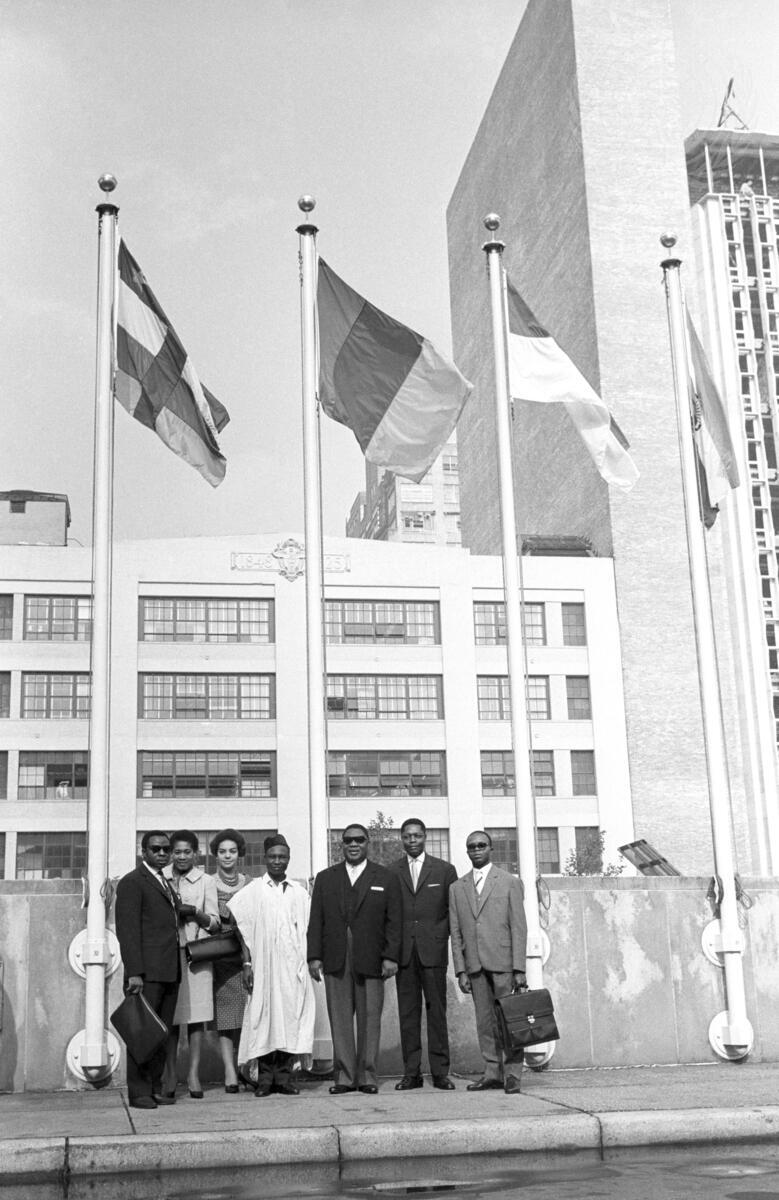 Members of the Republic of Cameroon are seen in front of their country's flag. Third from right is Mr. Charles Okala, Minister for Foreign Affairs and head of his Delegation.