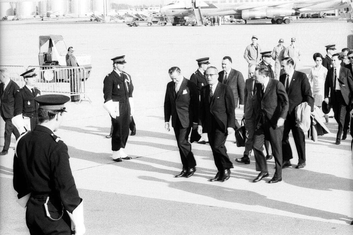 Secretary-General U Thant is seen at Orly Airport upon his arrival in Paris from London. To his left is Ambassador Roger Seydoux, Permanent Representative of France to the UN, and to his right is Mr. Bernard Durand, Chief of Protocol.
