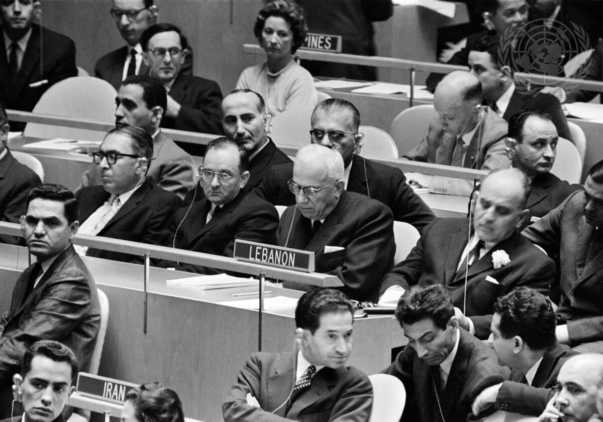 Member of the delegation of Lebanon are seen here at their country’s desk listing to the debate. From the right, they are (front only): Mr. Saeb Salaam (wearing carnation), President of the Council of Ministers of Lebanon; Mr. Fouad Ammoun, Secretary-General of the Ministry of Foreign Affairs; Mr. Georges Hakim; and Mr. Nadim Dimeckie.