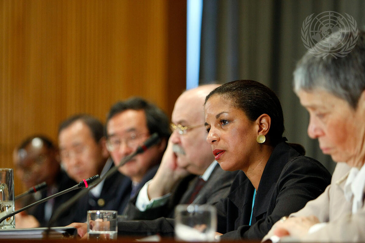 Susan Rice (second from right), Permanent Representative of the United States of America to the United Nations, addresses guests at the commemoration of the fifteenth anniversary of the Rwanda genocide.