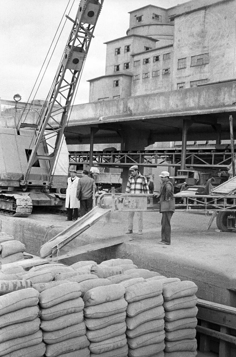 This picture shows the loading of bags of cement onto a barge. The bags arrive from the factory (seen in background) on a conveyor-belt.