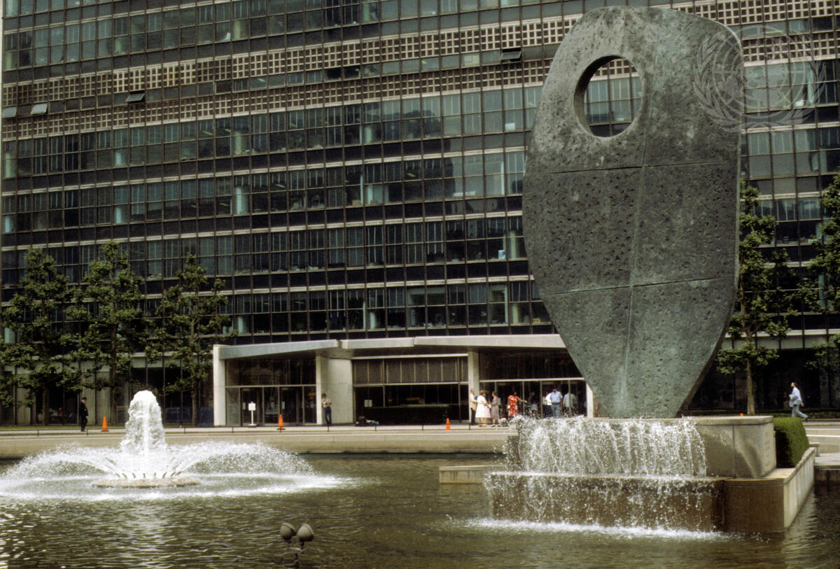 A free-form bronze abstraction, “Single Form”, by the British sculptor Barbara Hepworth, was made possible through a grant of Jacob Blaustein, a former member of the United States delegation to the United Nations. It stands 21 feet high on a granite plinth in the pool in front of the Secretariat Building. The sculptures, unveiled on 11 June 1964, weighs some five-and-a-half tons and represents 20-month's work by Miss Hepworth. [Rxact date unknown]