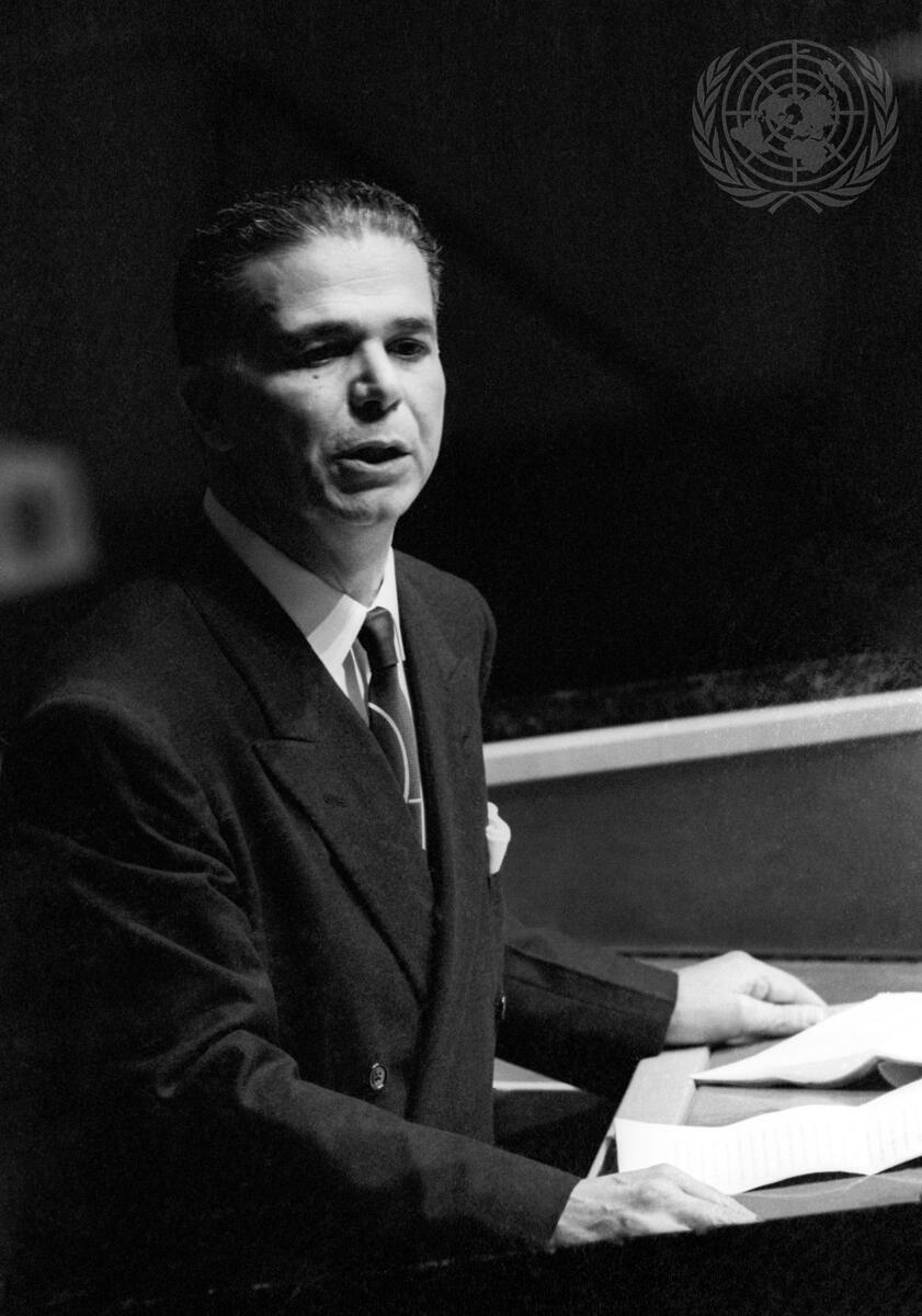 The General Assembly, continuing the general debate, this afternoon heard a statement by Dr. Joaquin Balaguer, President of the Dominican Republic. President Balaguer is seen here addressing the Assembly.