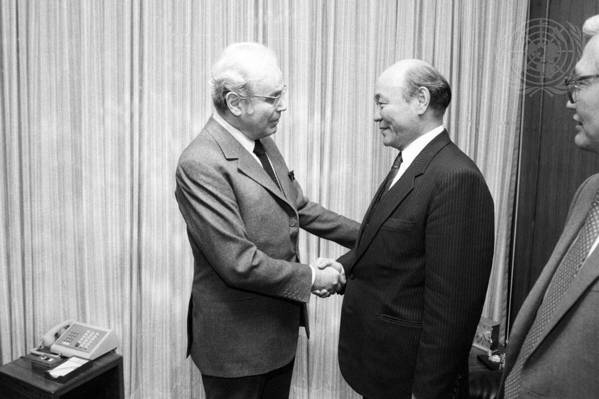 Secretary-General Javier Pérez de Cuéllar meeting with the Minister for Foreign Affairs of Mongolia, Mangalyn Dugersuren (right) at United Nations Headquarters in New York today.