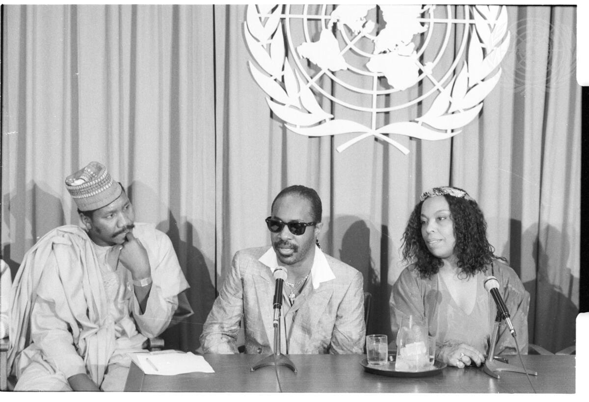 Stevie Wonder (centre), world renowned singer, today held a press conference at United Nations Headquarters after he vas presented a citation by the Special Committee Against Apartheid in recognition of Mr. Wonder's opposition to racial discrimination and apartheid. On 25 March, he accepted a Motion Picture Academy Award for the best song in the name of Nelson Mandela, the leader of the national resistance, serving a life sentence in South Africa.