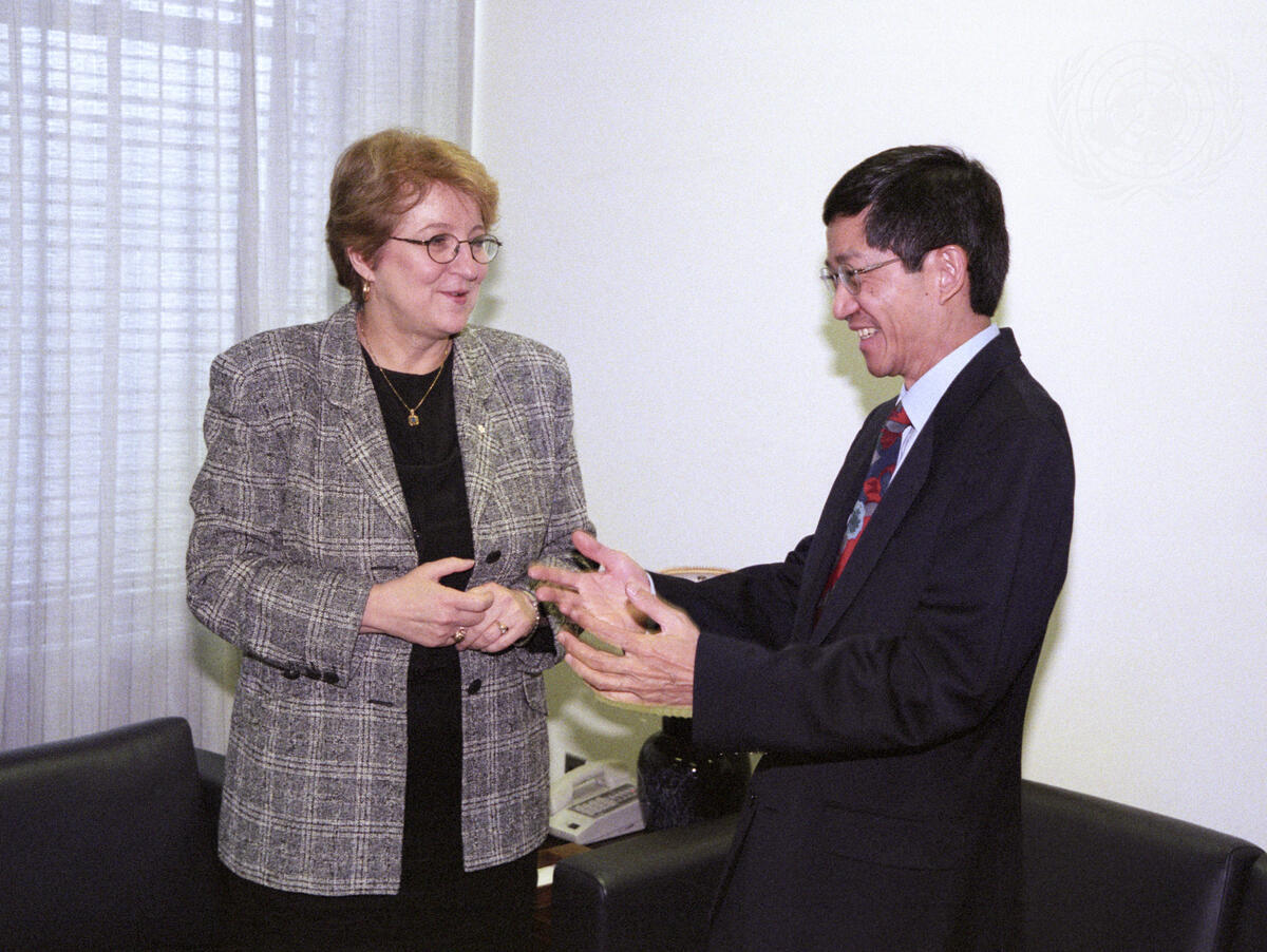 Taye Wah Michel Wan Chat Kwong (right), the outgoing Permanent Representative of Mauritius to the United Nations, pays a farewell call on Deputy Secretary-General Louise Frechette.