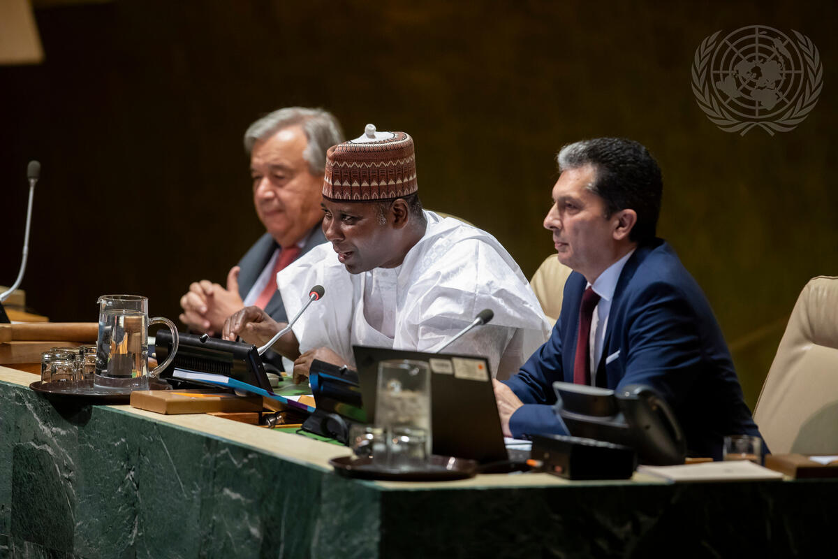 "Tijjani Muhammad-Bande (centre), President of the seventy-fourth session of the United Nations General Assembly, opens the general debate of the seventy-fourth session of the General Assembly.