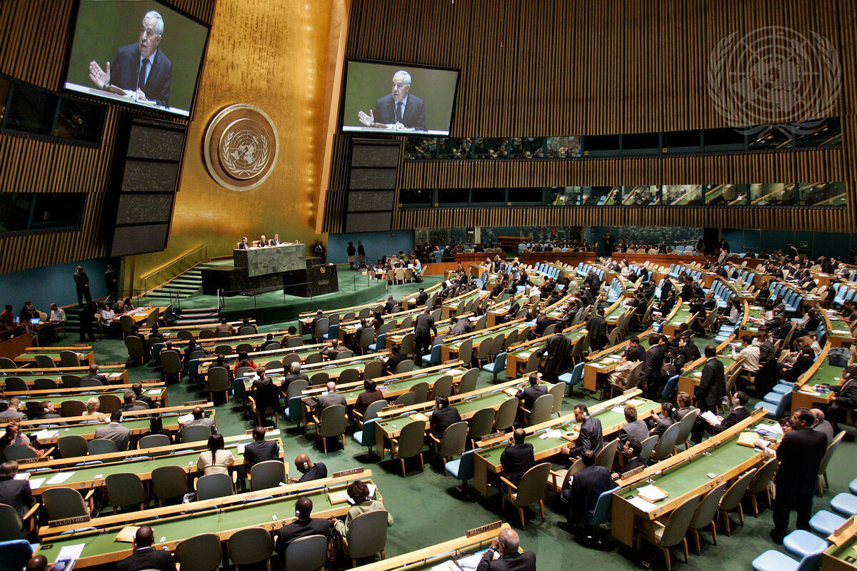 View of the General Assembly Hall during the opening meeting of the 64th session of the General Assembly, presided by Ali Abdussalam Treki of the Socialist People's Libyan Arab Jamahiriya, President of the 64th session of the General Assembly.