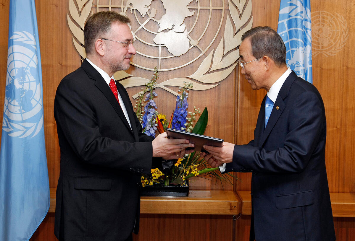 Ranko Vilovic, the new Permanent Representative of the Republic of Croatia to the United Nations, presents his credentials to Secretary-General Ban Ki-moon (right).