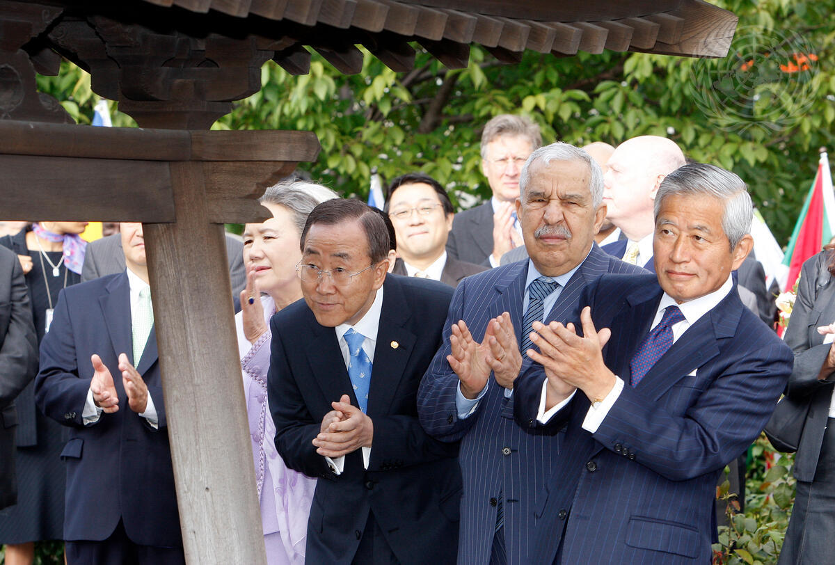 Secretary-General Ban Ki-moon (left), General Assembly President Ali Abdussalem Treki (centre) and Permanent Representative of Japan to the United Nations Yukio Takasu, at a ceremony marking International Day of Peace at the Rose Garden in United Nations Headquarters on 18 September. The ceremony was brought forward as the officially designated date for the observance, 21 September, is a United Nations holiday.