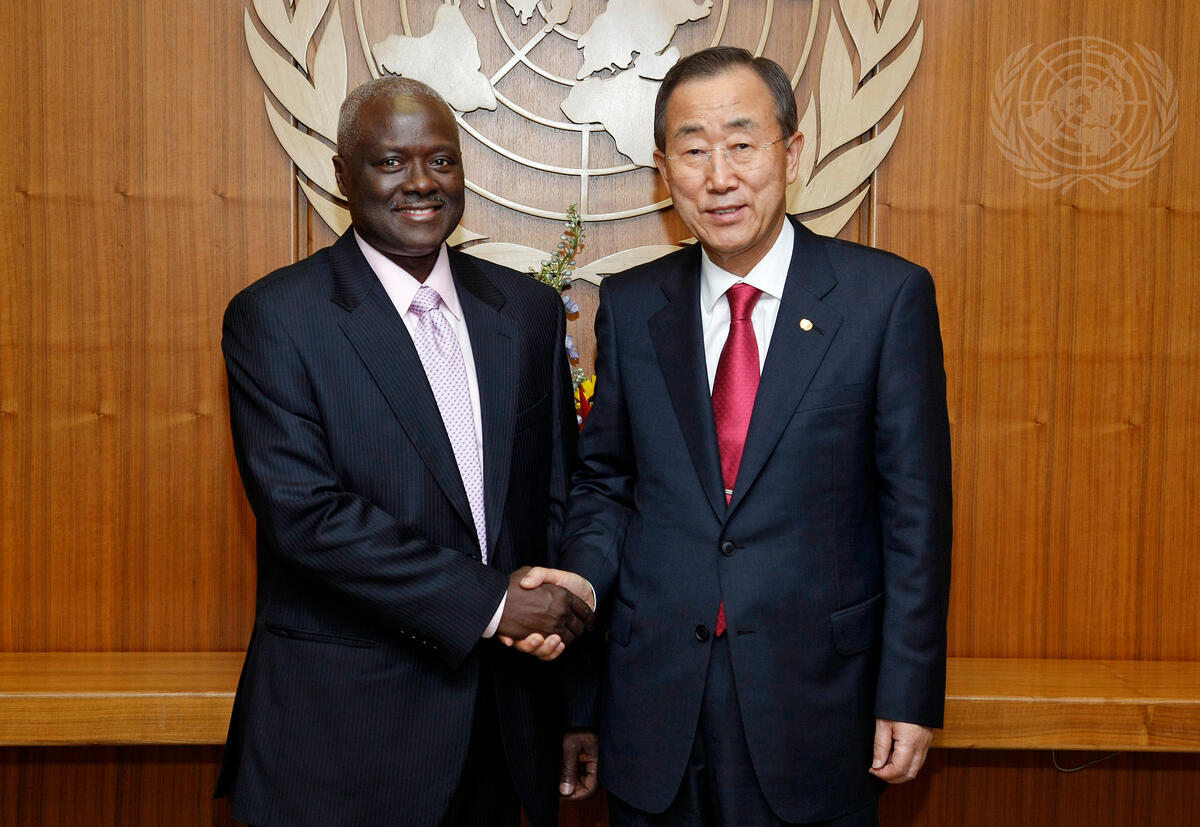 General Martin Luther Agwai (left), outgoing Force Commander of the African Union-United Nations Hybrid Mission in Darfur (UNAMID), pays a farewell call on Secretary-General Ban Ki-moon.