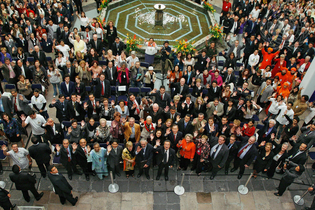 Participants pose for a group photo at the opening of the 62nd annual UN Department of Public Information (DPI) and Non-governmental Organizations (NGOs) Conference. The meeting this year focuses on disarmament and takes place in Mexico City on 9-11 September.