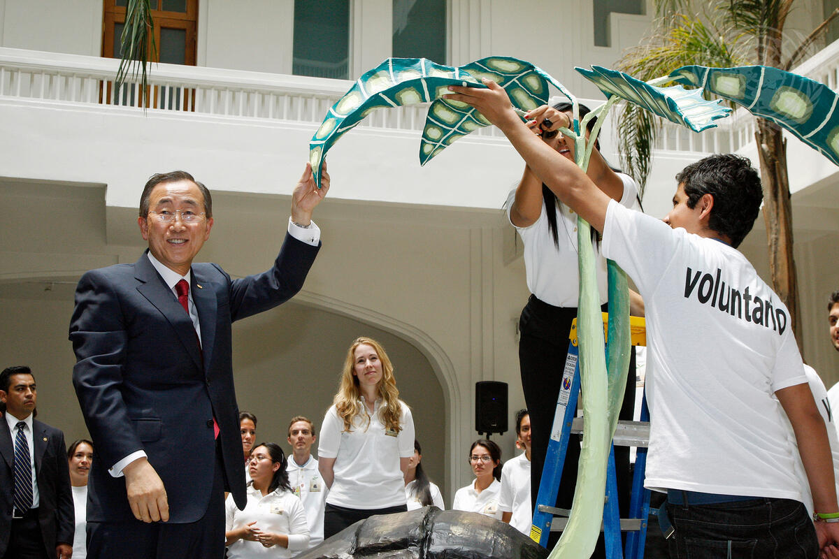 Secretary-General Ban Ki-moon joins Mexican youth at a side event held at the Museo de Arte Popular in Mexico City, in the course of the 62nd annual UN Department of Public Information (DPI) and Non-governmental Organizations (NGOs) Conference, which this year focuses on disarmament. The youth, clad in T-shirts with the conference logo -- a tree growing out of an exploded grenade -- built a sculpture reflecting the logo.