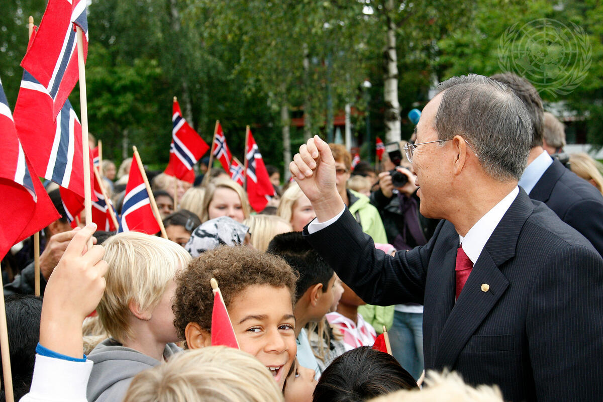 Secretary-General Ban Ki-moon (right) is greeted by Norwegian children after attending a wreath-laying ceremony at the memorial monument for Norway's Trygve Lie, the first Secretary-General of the United Nations.