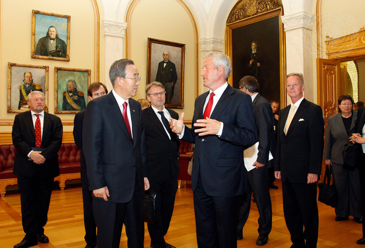 Secretary-General Ban Ki-moon meets Thorbjørn Jagland, President of the Storting, the Norwegian Parliament.