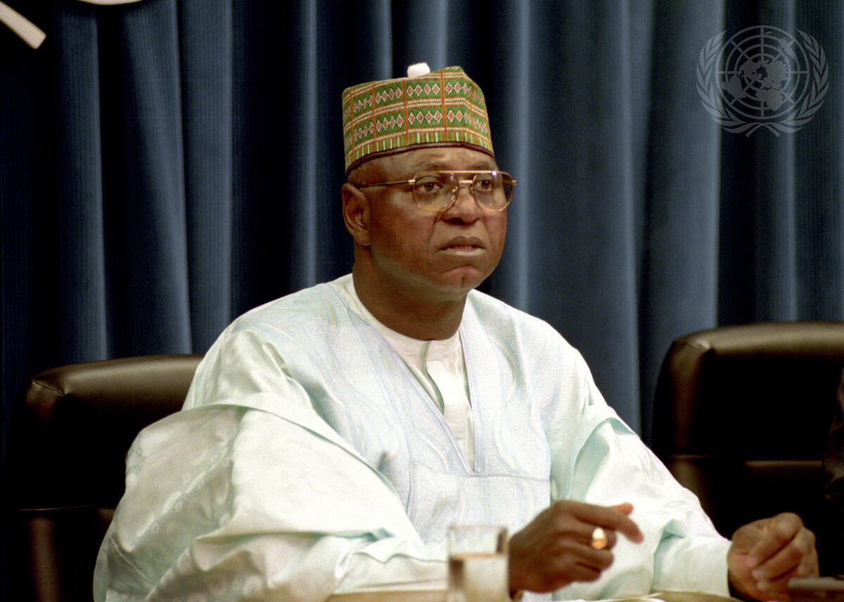 Abdulsalami Abubakar, Head of State, Commander in Chief of the Armed Forces of Nigeria, addresses a press conference at headquarters.