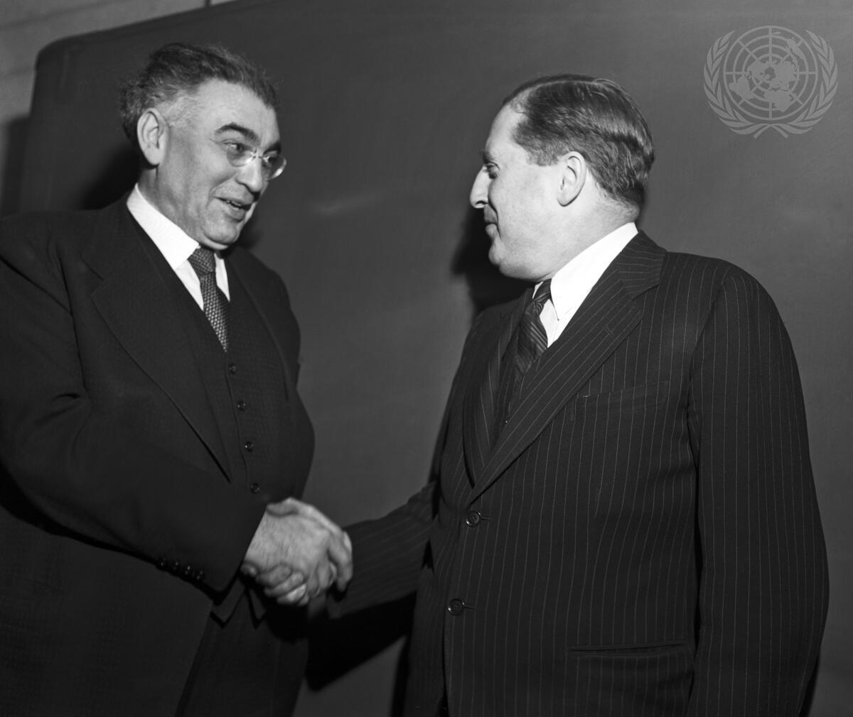 Jewish Agency representative, Rabbi Abba Hillel Silver, left, receives congratulations from Herschel V. Johnson, member of the United States delegation to the United Nations. At the final meeting of the Second Session, the General Assembly approved the partition of Palestine into Arab and Jewish states, by a vote of 33 to 13, with 10 abstentions and one absence.