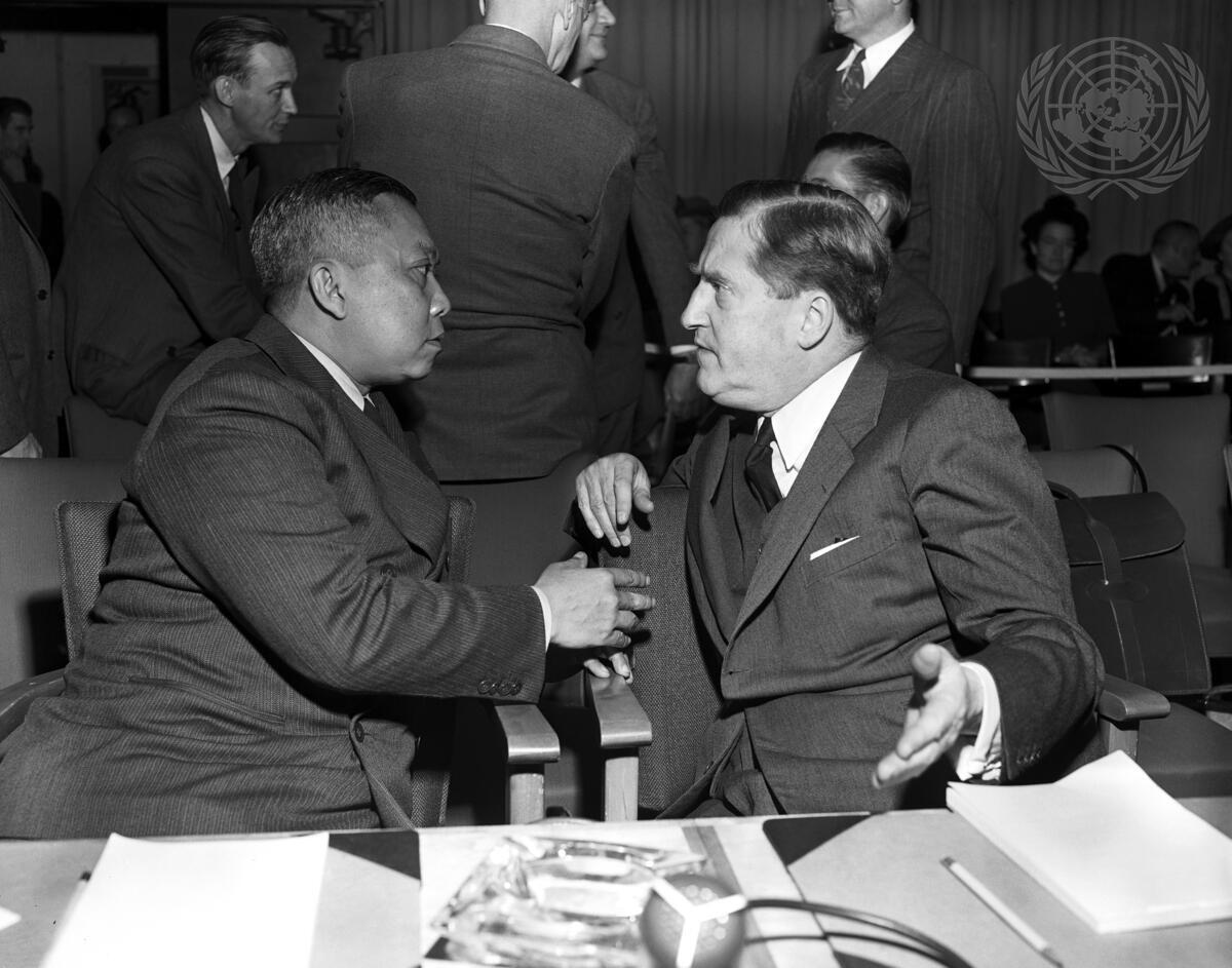 Herschel V. Johnson, United States representative to the Second Session of the United Nations General Assembly, talks with Prince Subha Svasti Svastivat of Siam, at conference table before the 30th meeting of the Assembly’s Ad Hoc Committee on the Palestine Question.