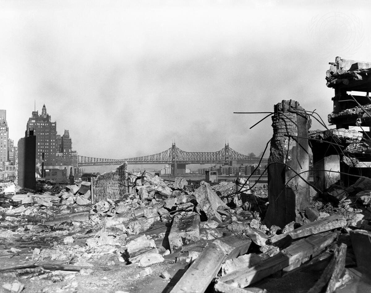 Heaps of rubble between 43rd and 44th Streets mark the present state of demolition on the site of the United Nations permanent headquarters located on Manhattan’s East River.