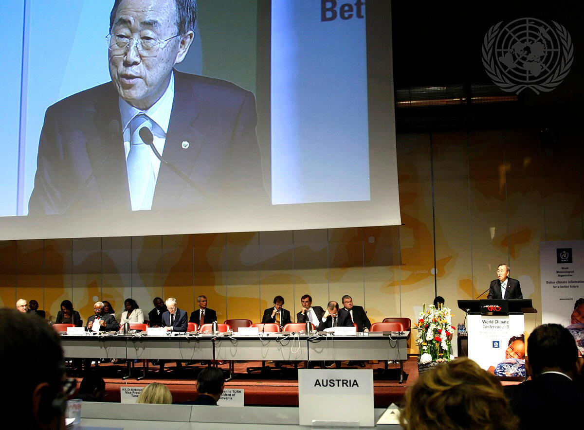 Secretary-General Ban Ki-moon (right) addresses the World Climate Conference-3 (WCC-3) in Geneva.