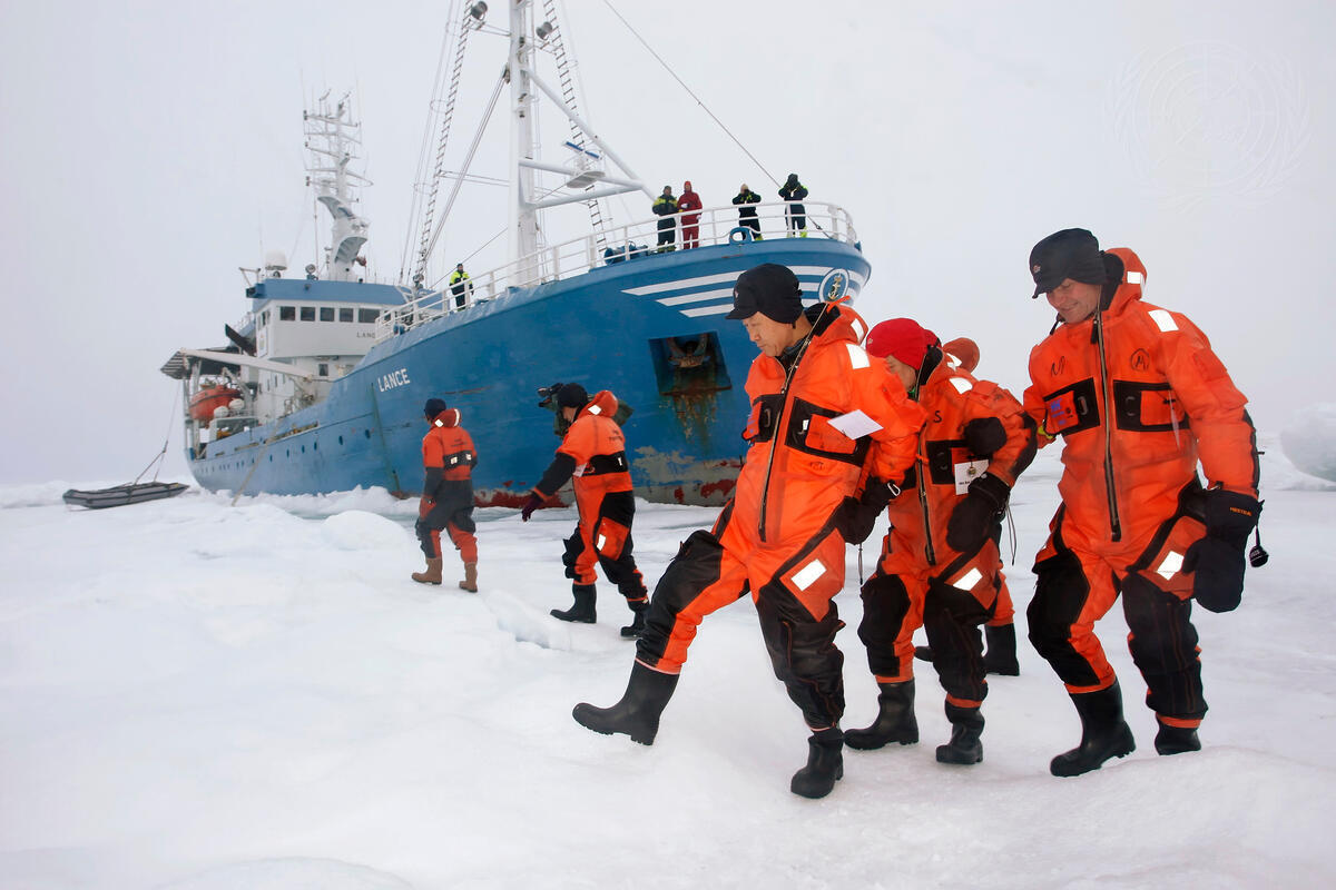 Secretary-General Ban Ki-moon (third from left) visits the Polar ice rim to witness firsthand the impact of climate change on icebergs and glaciers. The visit is part of the UN Chief's campaign urging Member States to negotiate a fair, balanced and effective agreement at the UN Climate Change Conference in Copenhagen in December.