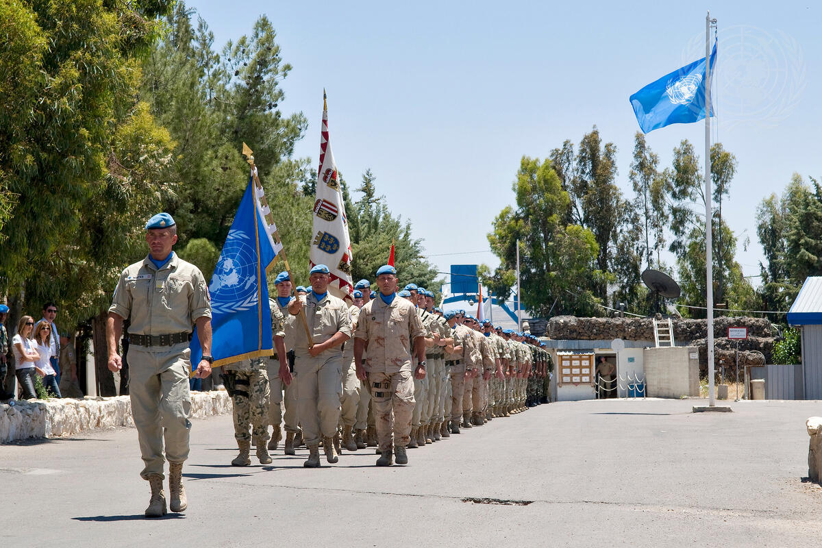 Troops of the United Nations Disengagement Observer Force (UNDOF) march to celebrate the 35th Anniversary of the Mission. UNDOF was established by Security Council resolution 350 (1974) of 31 May 1974 following the agreed disengagement of the Israeli and Syrian forces in the area and continues to supervise the implementation of the agreement and maintain ceasefire.