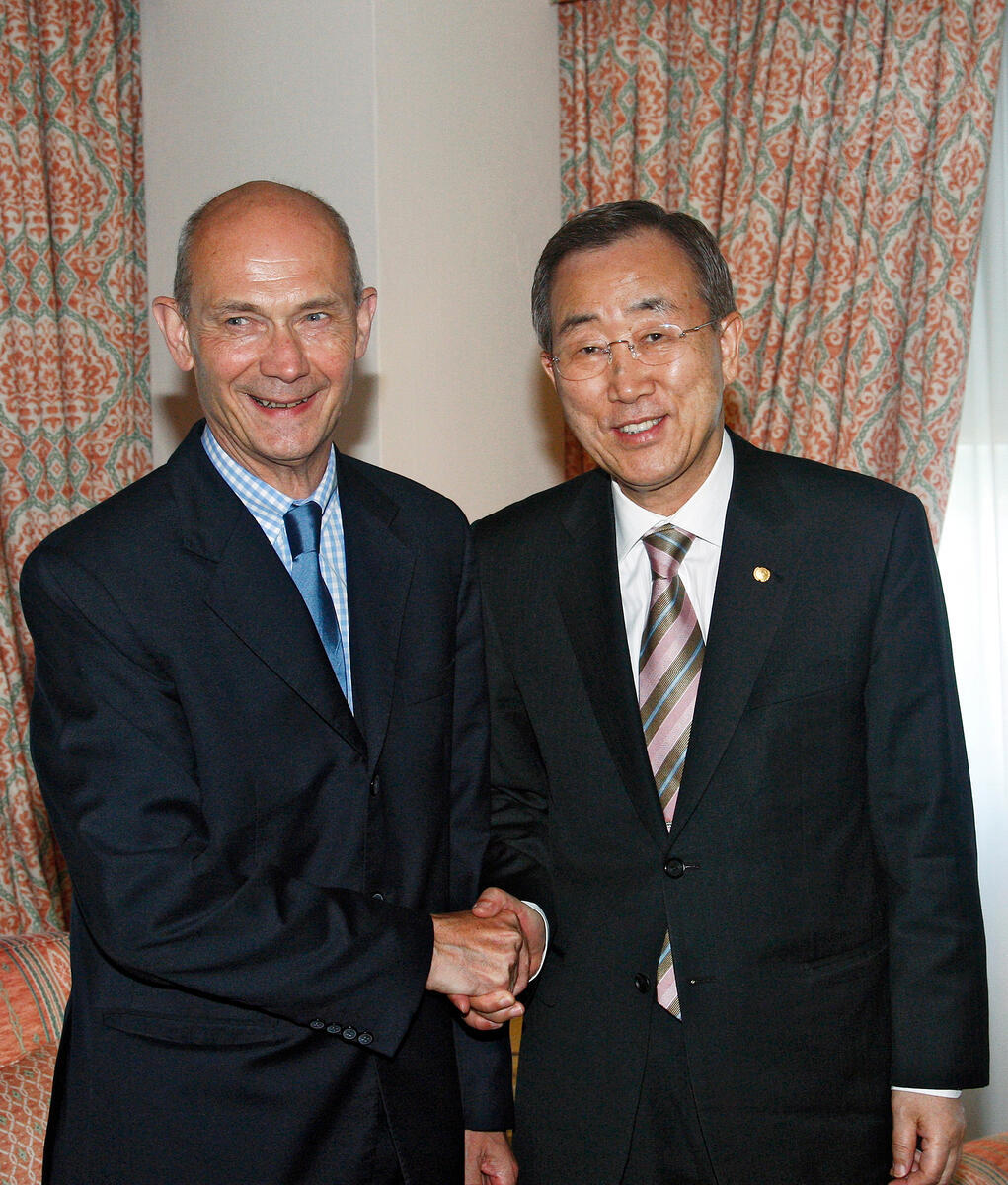 Secretary-General Ban Ki-moon (right) meets with Pascal Lamy, Director-General of the World Trade Organization (WTO).