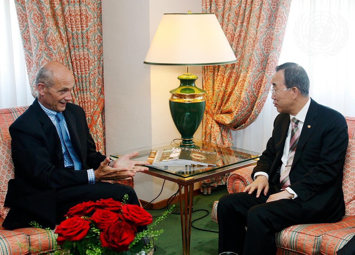 Secretary-General Ban Ki-moon (right) holds talks with Pascal Lamy, Director-General of the World Trade Organization (WTO).