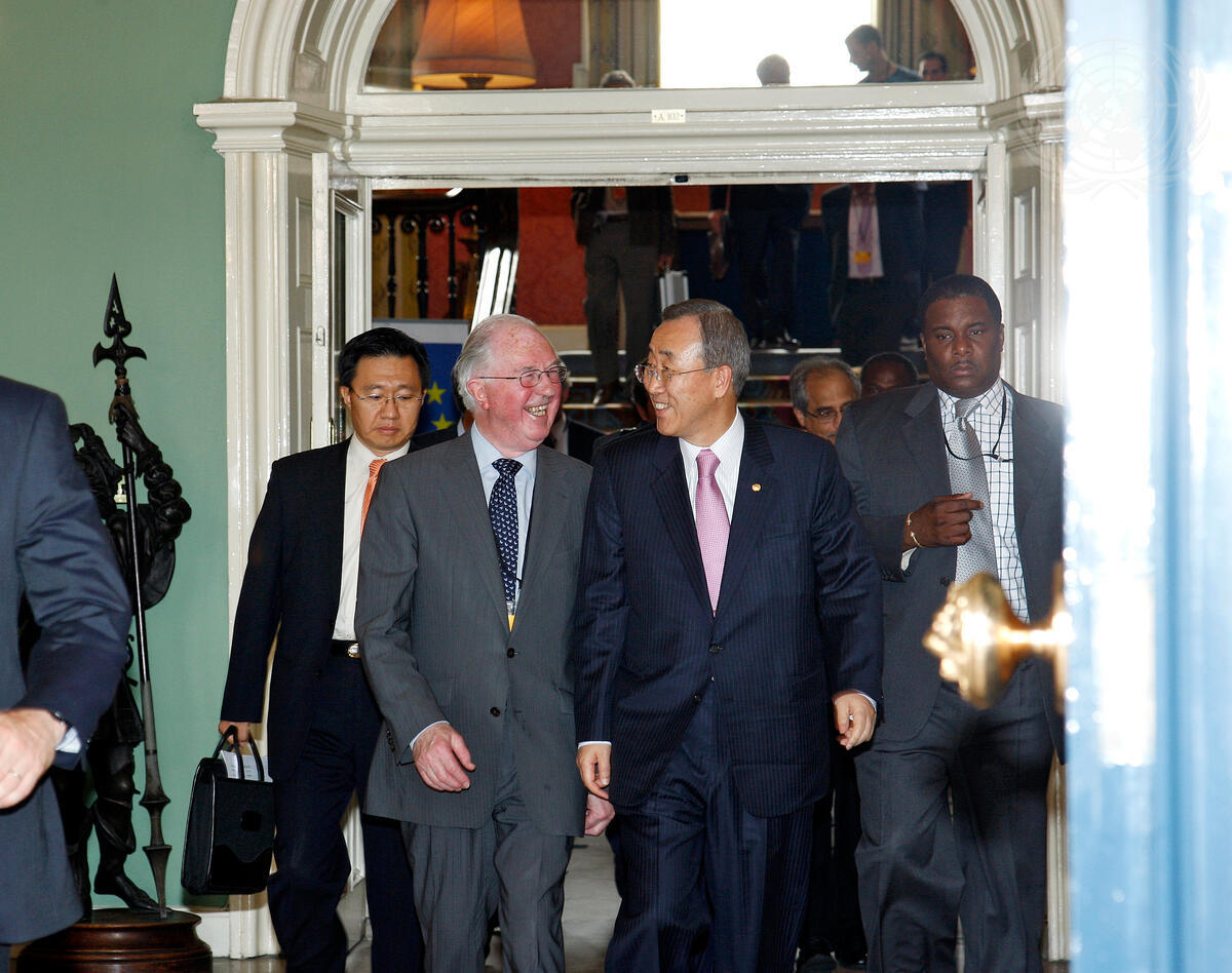 Secretary-General Ban Ki-moon (second from right) and Brian Cowen (second from left), Prime Minister (Taoiseach) of Ireland, after the former addressed the guests of the Institute of International and European Affairs on the United Nations Peacekeeping Operations, at the Dublin Castle.