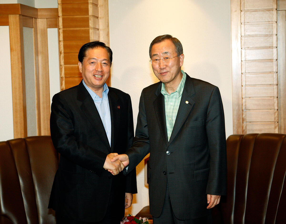 Secretary-General Ban Ki-moon (right) meets with Akihiro Ota, Chief Representative of the New Komei Party, in Tokyo.