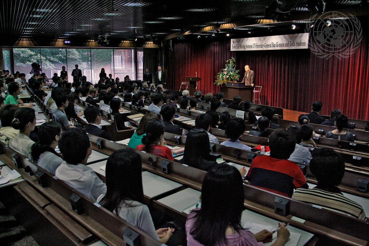 Secretary-General Ban Ki-moon (at podium) addresses a town hall meeting at the University of Tokyo.