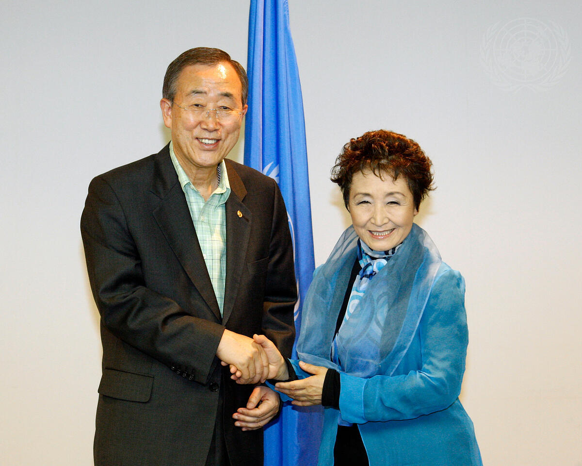 Secretary-General Ban Ki-moon (left) meets with Tokiko Kato, Special Envoy of the United Nations Environment Programme (UNEP), and Japanese folk-singer.