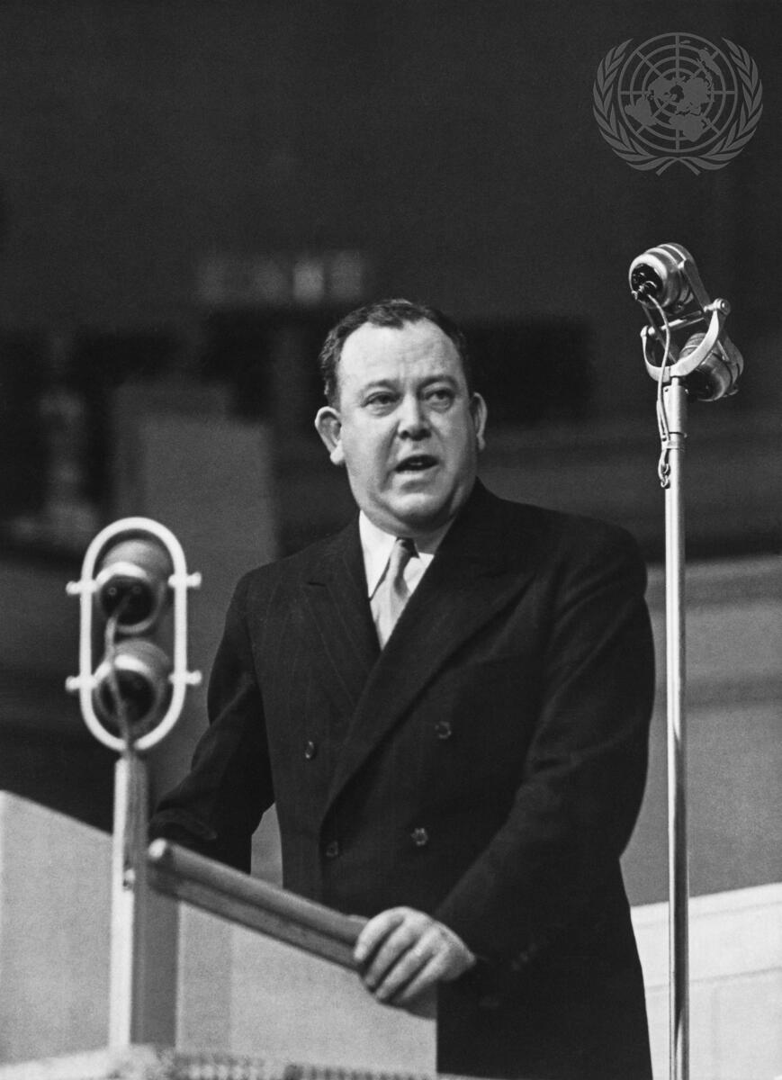 Trygve Lie of Norway addresses the General Assembly on the occasion of his formal appointment as first Secretary-General of the United Nations, on 2 February 1946.